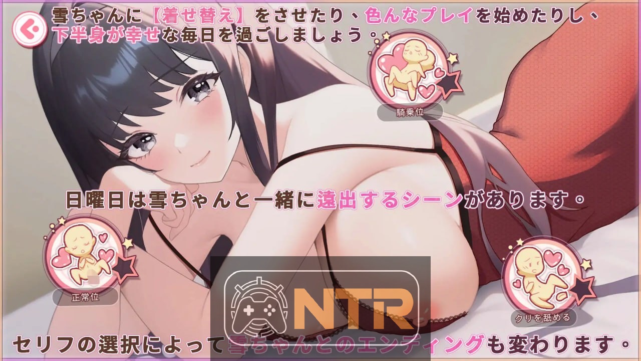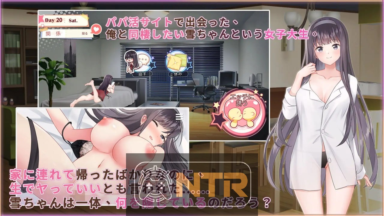 哎呀,这款养成互动SLG啊,就跟都市上班族突然捡到个小惊喜似的,通过个パパ活app碰到那个萌萌的女大学生“小雪”,她居然直球说要同居,还嚷嚷着要无套来一发初体验啥的,玩家呢,就得从这儿开始琢磨日常怎么过:工作日早上纠结是瞅瞅电视放松、跟小雪闲扯淡,还是早起出门多挣点钱;晚上嘛,聊天解闷或者直接来点H互动,周末拉着她出门约会浪一浪,或者刷网购给她买新衣服解锁各种角色扮演玩法。总共25张基CG,变体超300张,Live2D让那些H场面活灵活现,中出口交胸交再加点玩具轻SM啥的,重点是那从生疏到黏糊的纯爱小过程。多结局等着你(幸福大团圆或分道扬镳),官中步兵版PC安卓都行,日语音配多语言字幕,玩个2-4小时,就能感受到同居的暖意和那股辣劲儿。