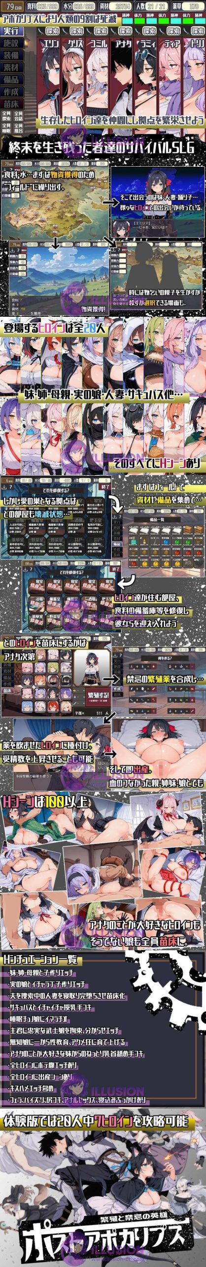 背景设定在末日浩劫后,一场猛烈疫情席卷全球,只剩抗体携带者苟延残喘。资源紧缺到爆,幸存者间杀红眼。玩家化身主角,为求活路只好碰那些见不得光的玩意儿——钻进破败都市搜罗材料,拼凑出“禁忌道具”(把妹子衣服啥的改造成情趣玩具),一步步拿下几个女角,让她们彻底“苗床化”(身心都献出来,变身专职生娃工具,任由播种灌溉,生出一堆小生命来壮大人类族群)。