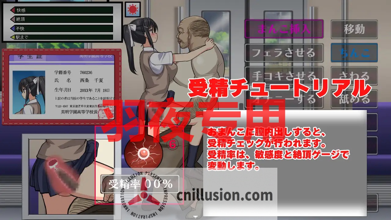 - 没啥日子限制,也不会突然game over,随便玩着开心就好,从先凑近身→摸摸大腿或腰来刷敏感度(翻学生手册瞧瞧进度),等不快值降下来再上跳蛋加揉奶→大叔老二直接插进去,多回合内射攒绝顶点数→搞到怀孕就算过关。